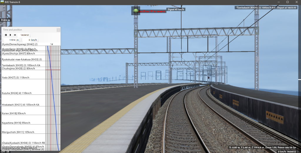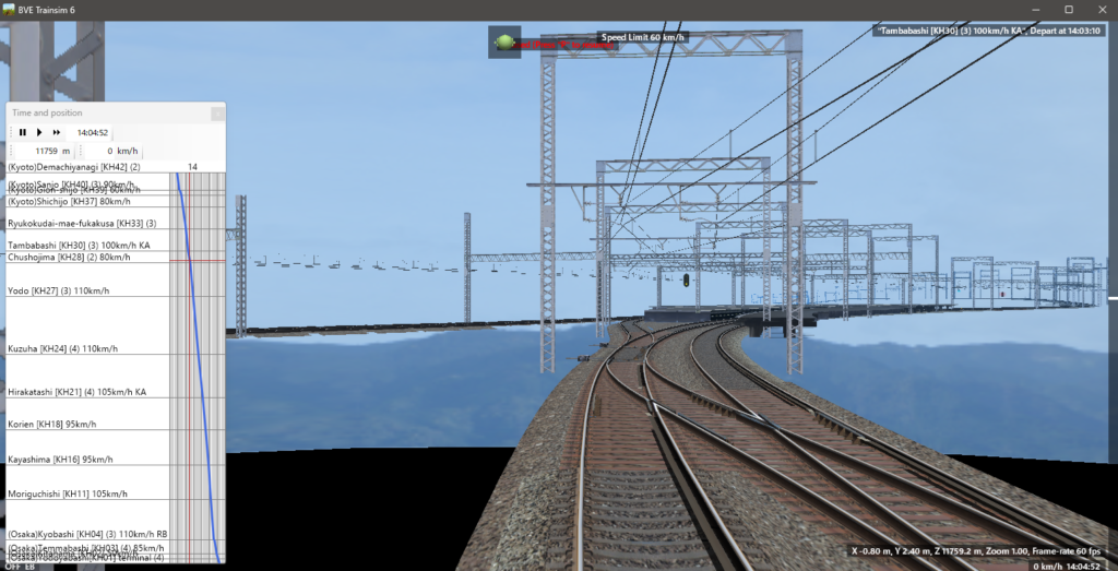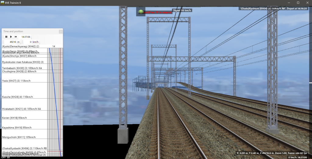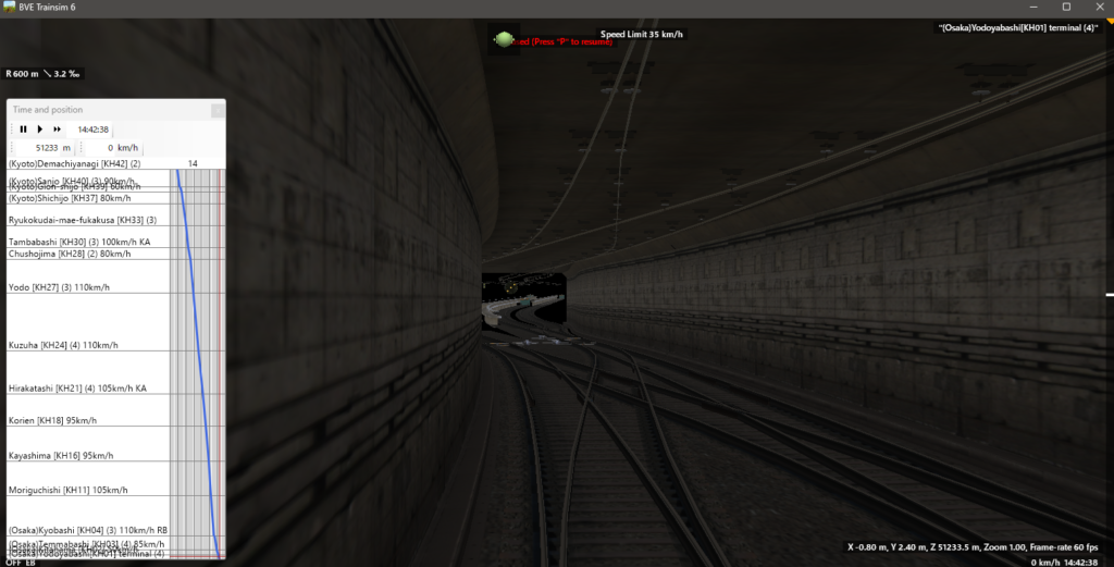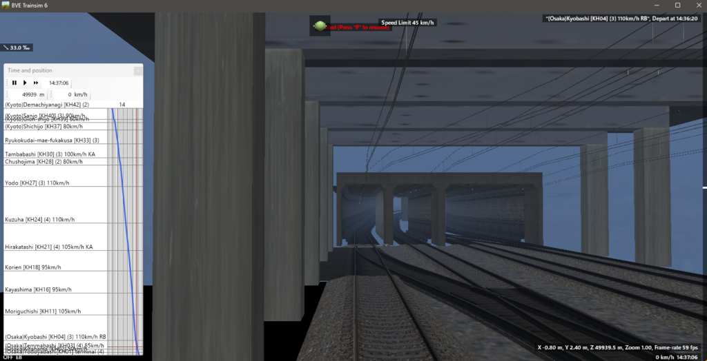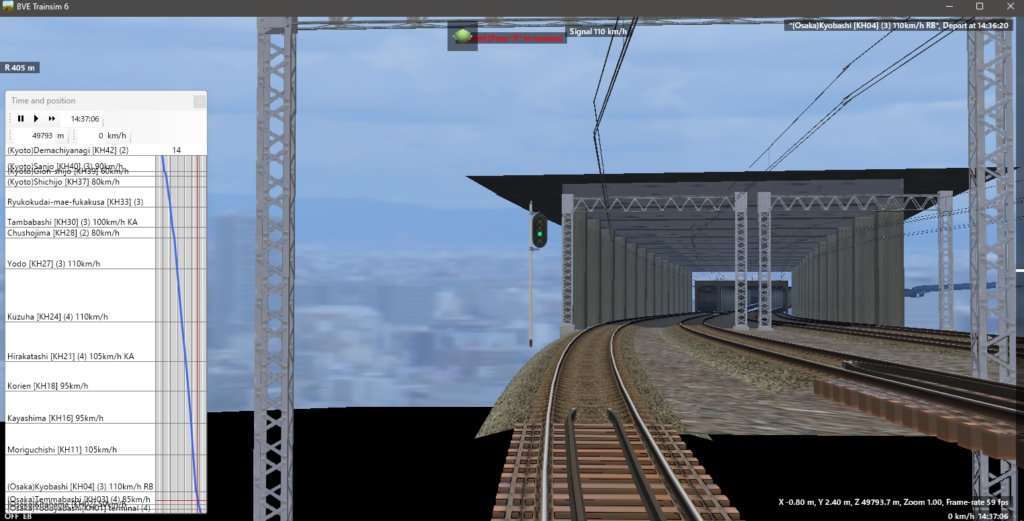 本作で一番ミスったなと思うのがこの地点で、もう取り返しがつかない状態です。Z=0は地上の天満橋駅中心があった地点にするのが正しいですが、本作だとミスって地下の天満橋駅東端付近にZ=0を置いてしまっていて、天満橋-香里園で何カ所もZ座標の整合性がとれない問題を起こしてしまっています。このミスをしたのは2015年ですが、私はタイムマシンを持っていないので直せません。本作はこのままうまいことまとめあげるしかないです。2015年から現在までの間に資料が揃い切っているのでこの類のミスはもう起こらないと思いますが、この数年で私の乱視がきつくなってしまい今後長期的にプレイヤーを続ける自信がないので、なるべく良い材料を残して後進に道を譲ることを意識しています。