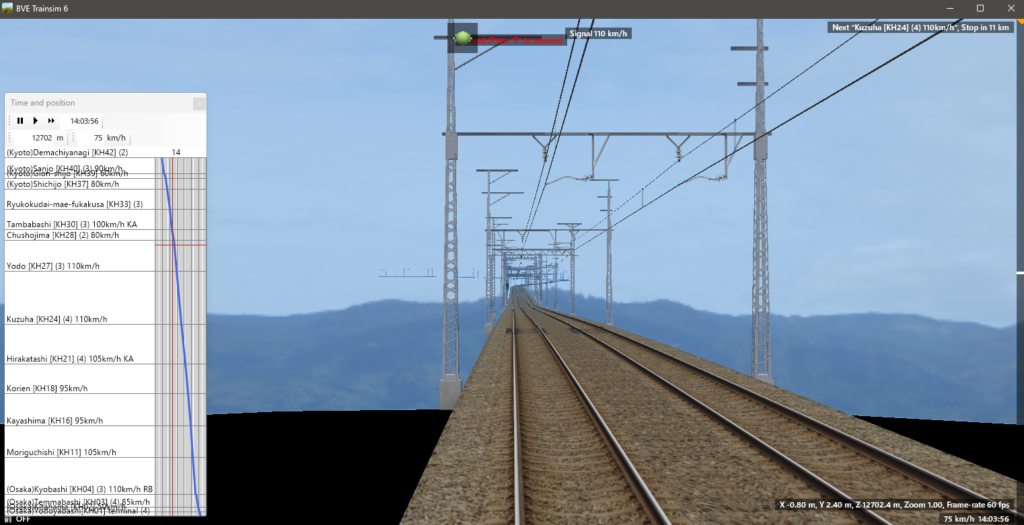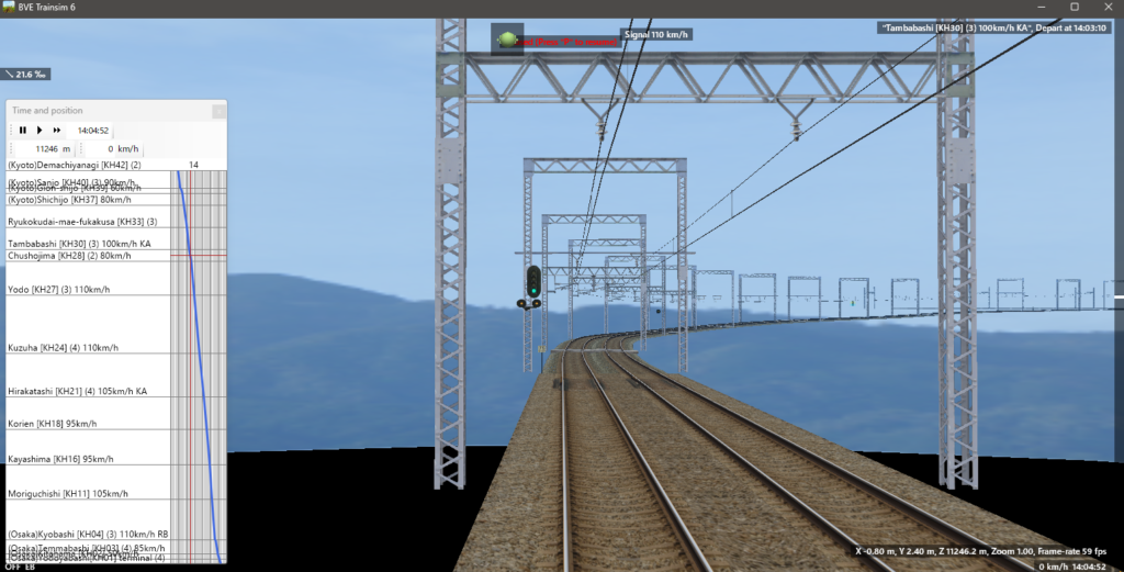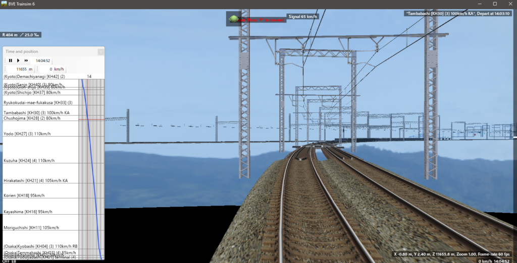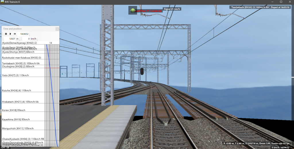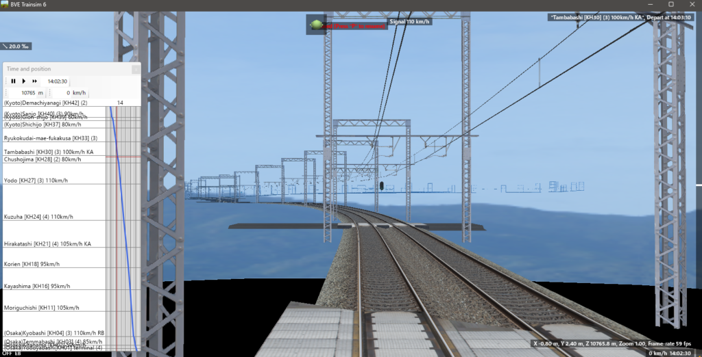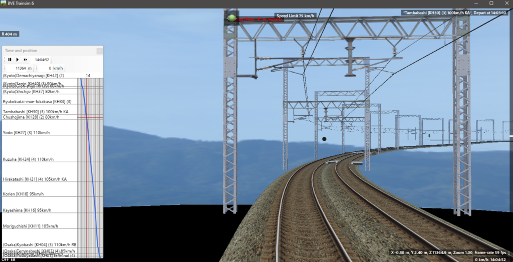 本作で一番ミスったなと思うのがこの地点で、もう取り返しがつかない状態です。Z=0は地上の天満橋駅中心があった地点にするのが正しいですが、本作だとミスって地下の天満橋駅東端付近にZ=0を置いてしまっていて、天満橋-香里園で何カ所もZ座標の整合性がとれない問題を起こしてしまっています。このミスをしたのは2015年ですが、私はタイムマシンを持っていないので直せません。本作はこのままうまいことまとめあげるしかないです。2015年から現在までの間に資料が揃い切っているのでこの類のミスはもう起こらないと思いますが、この数年で私の乱視がきつくなってしまい今後長期的にプレイヤーを続ける自信がないので、なるべく良い材料を残して後進に道を譲ることを意識しています。