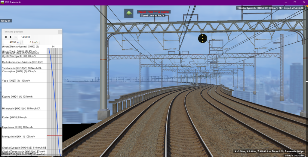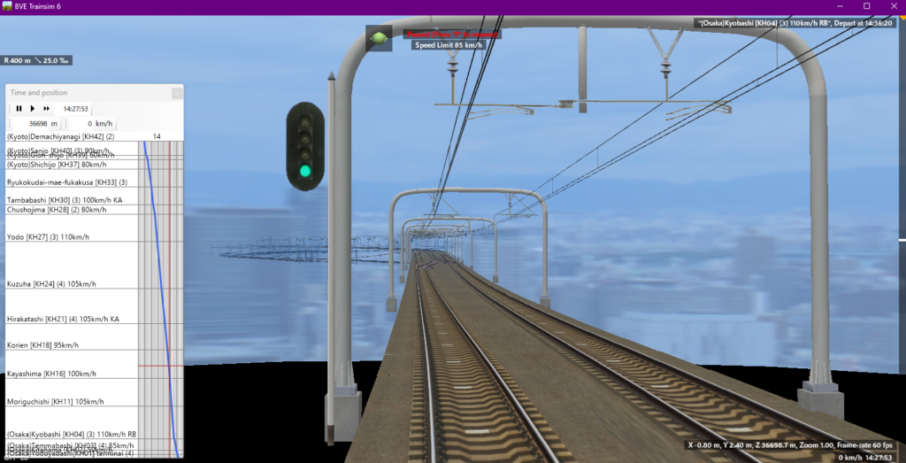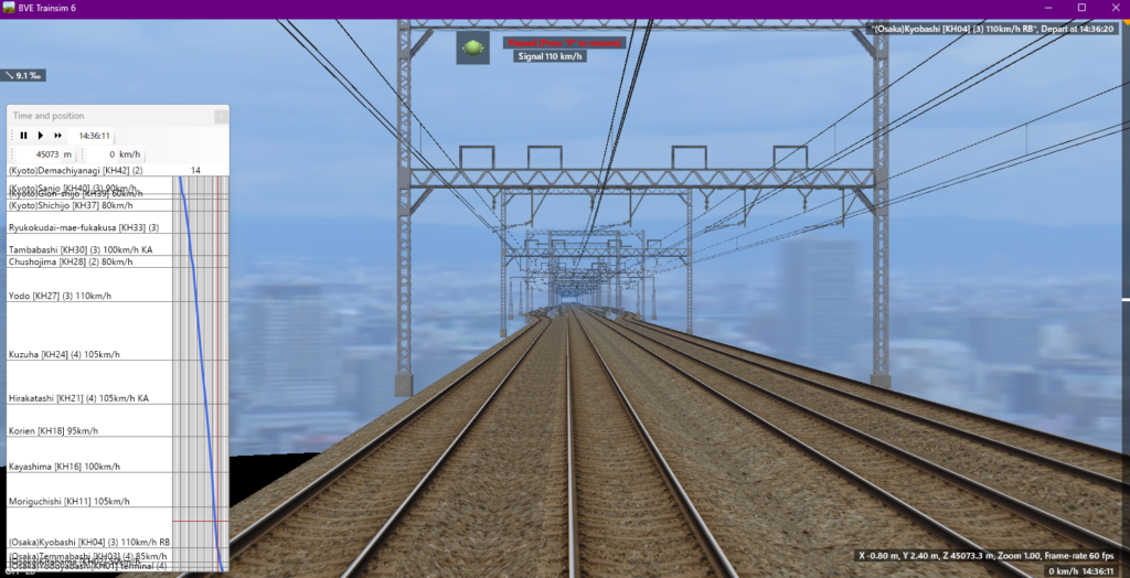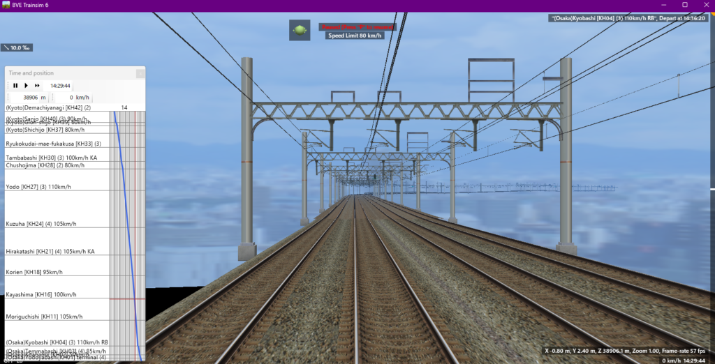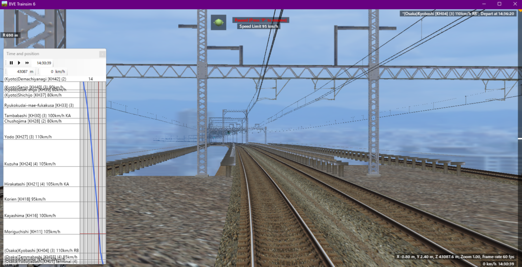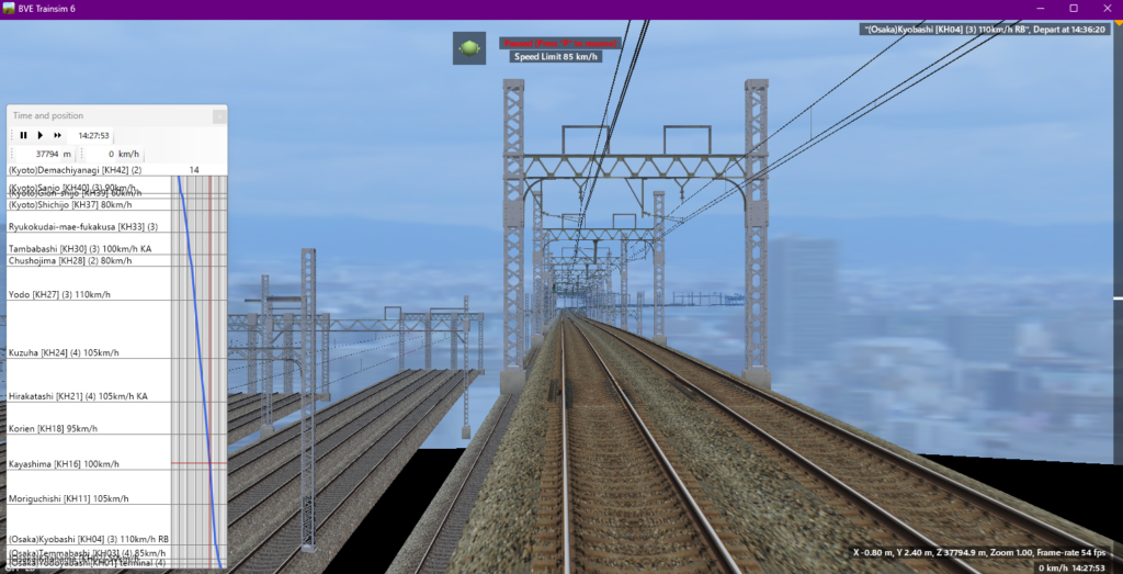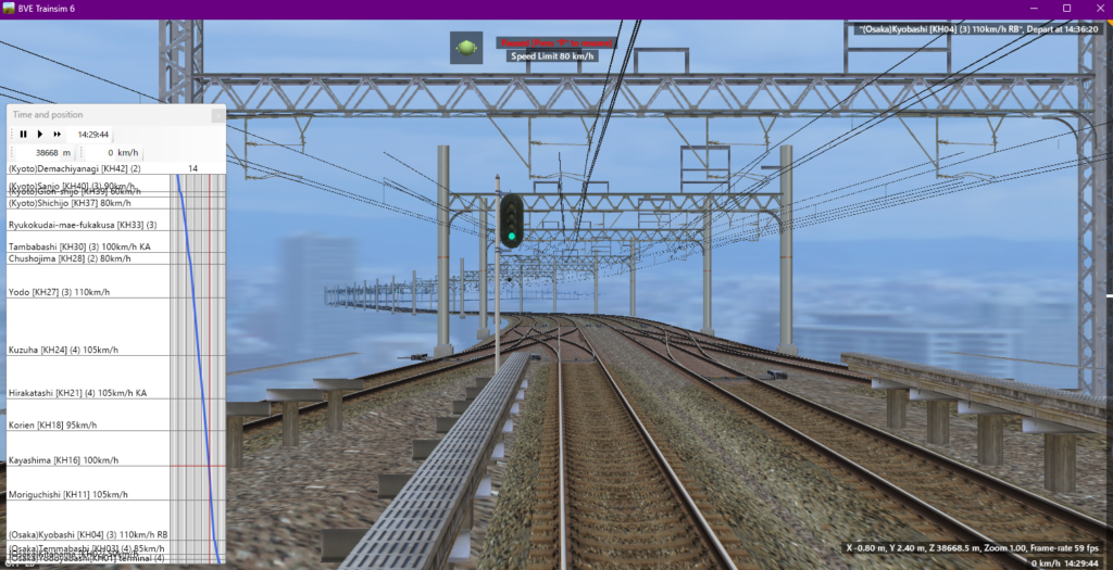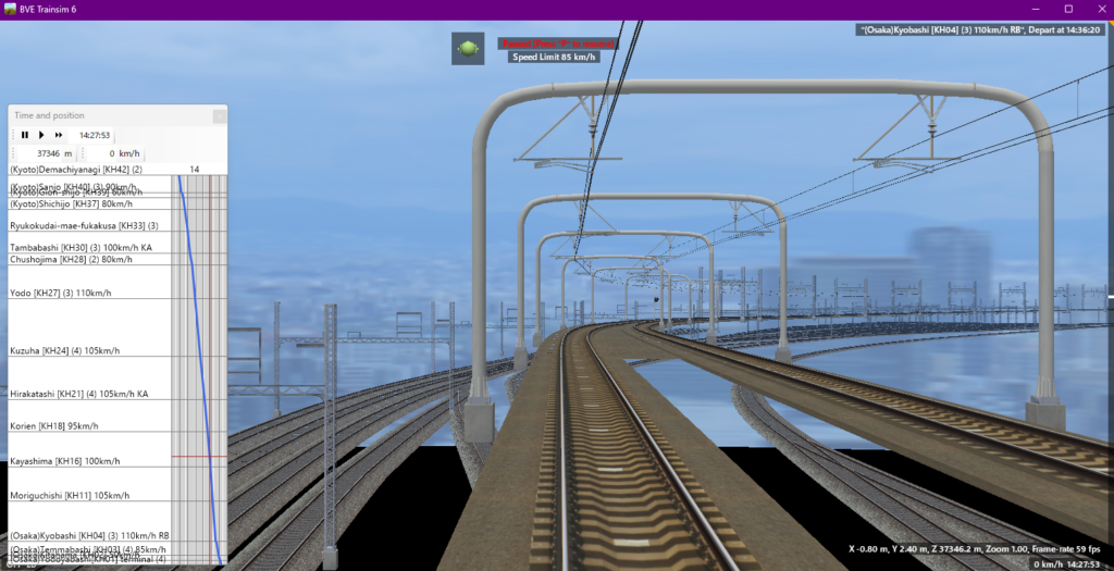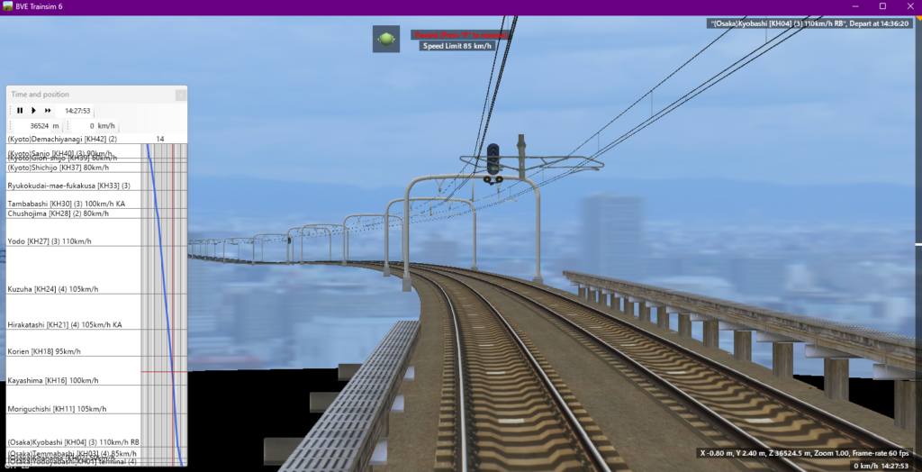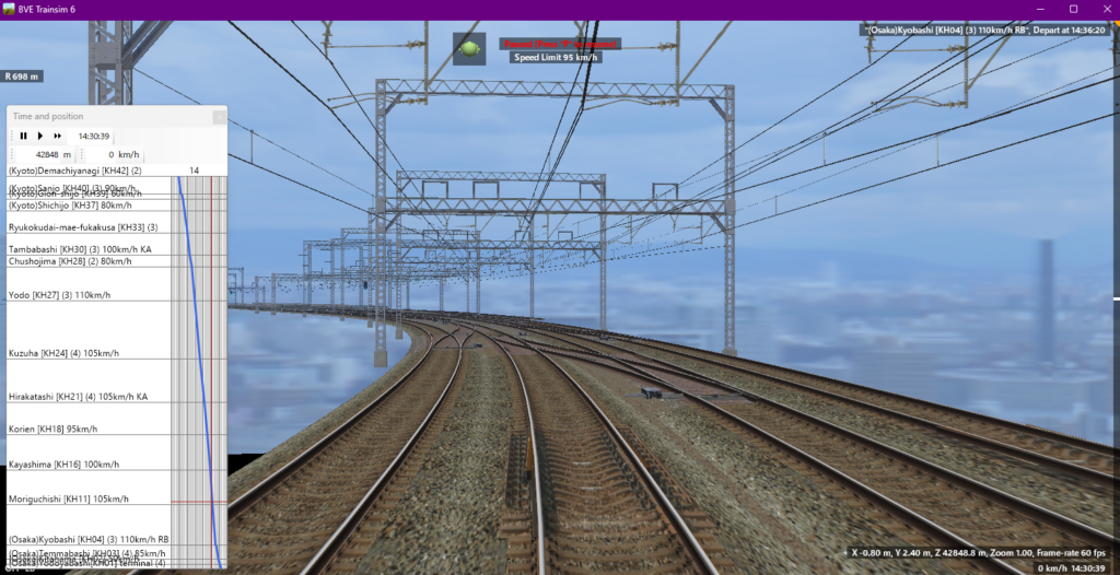 普通に走っていたら枚方市はそこそこ遅れて発車すると思いますが、萱島通過が1分以上遅れそうなら制限85解除から萱島上手の制限80の間を少し加速して通過します。昼間の特急スジは急な混雑への対応も考慮してか若干寝ているのでまだあわてるような時間ではないです。