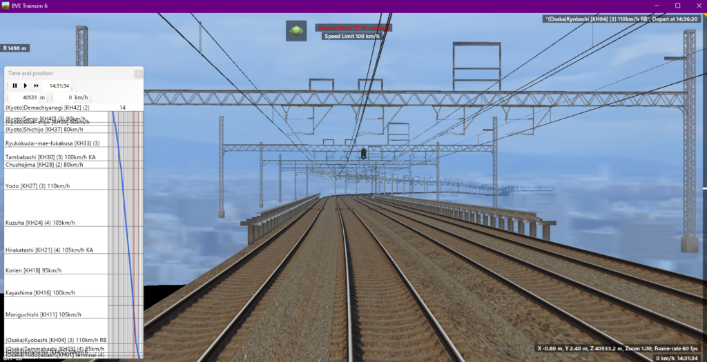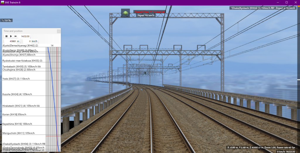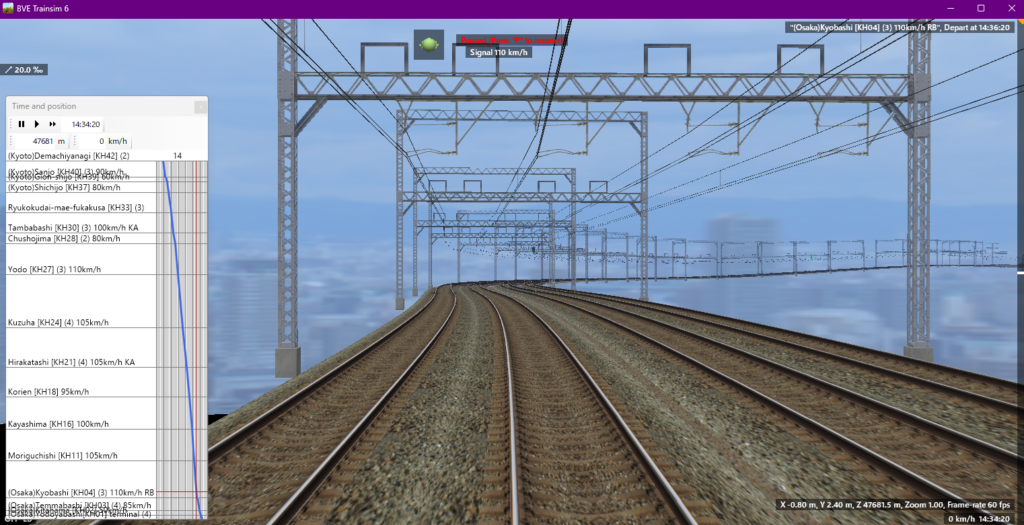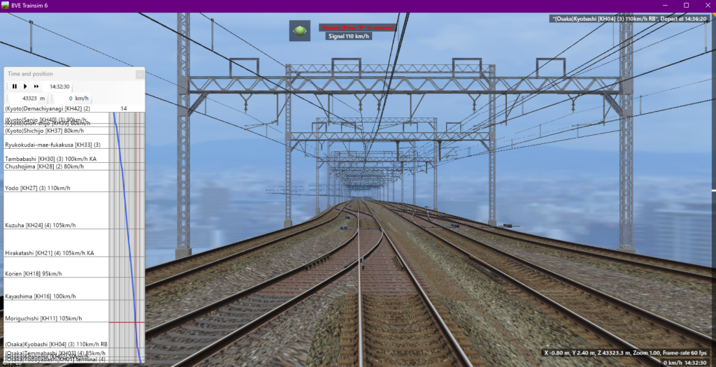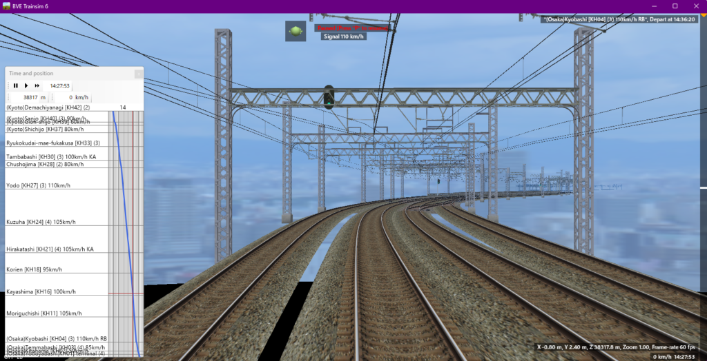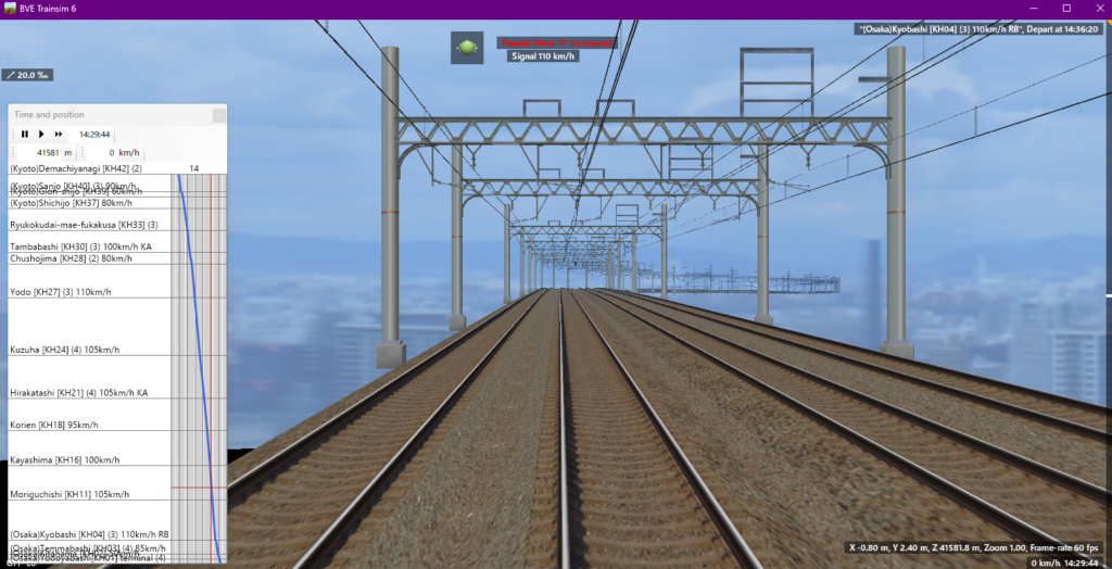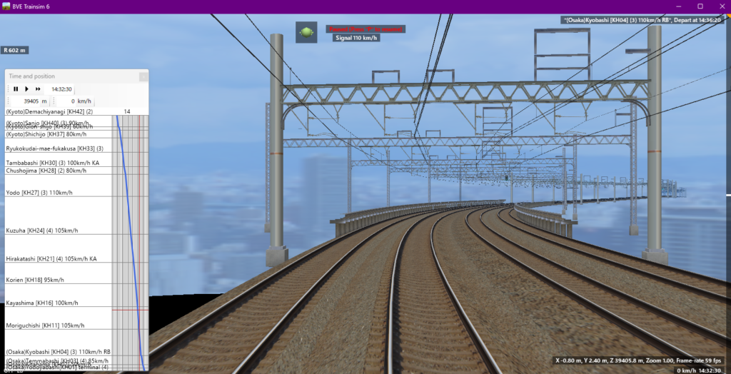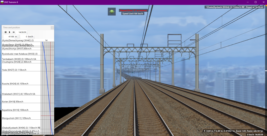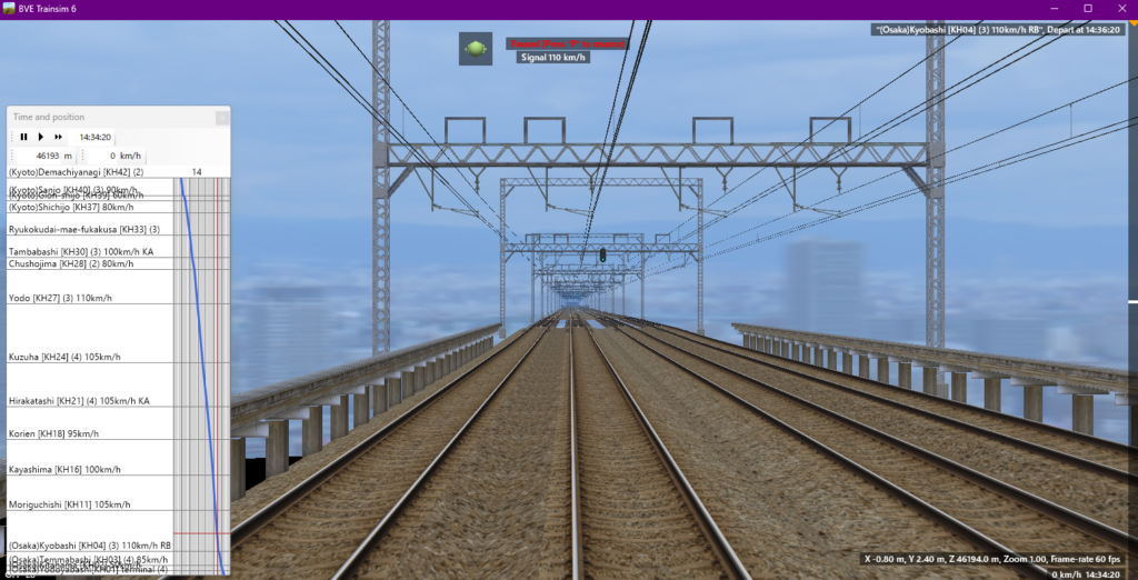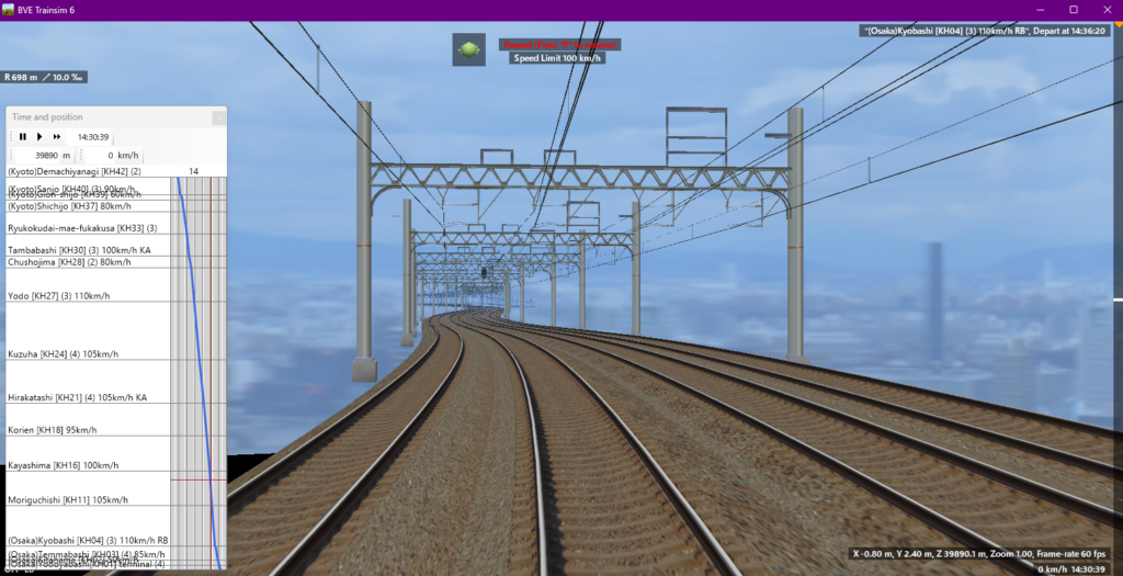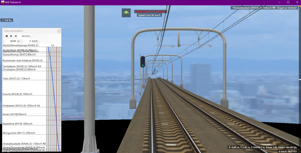 普通に走っていたら枚方市はそこそこ遅れて発車すると思いますが、萱島通過が1分以上遅れそうなら制限85解除から萱島上手の制限80の間を少し加速して通過します。昼間の特急スジは急な混雑への対応も考慮してか若干寝ているのでまだあわてるような時間ではないです。